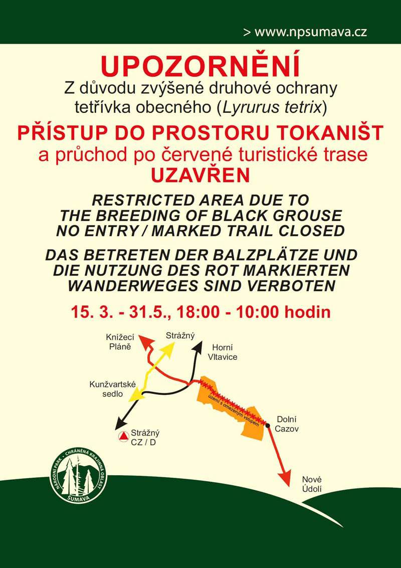 ukázka cedule v terénu, která vysvětluje zákaz přístupu do lokalit tokanišť tetřívka obecného